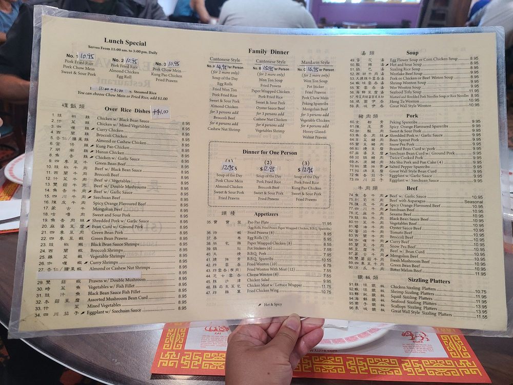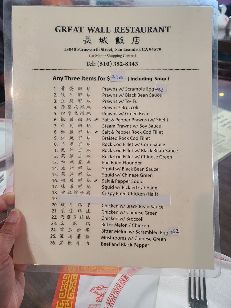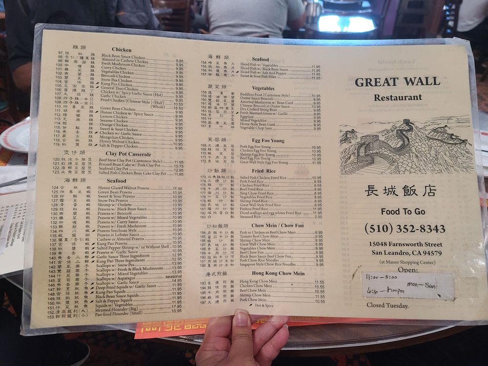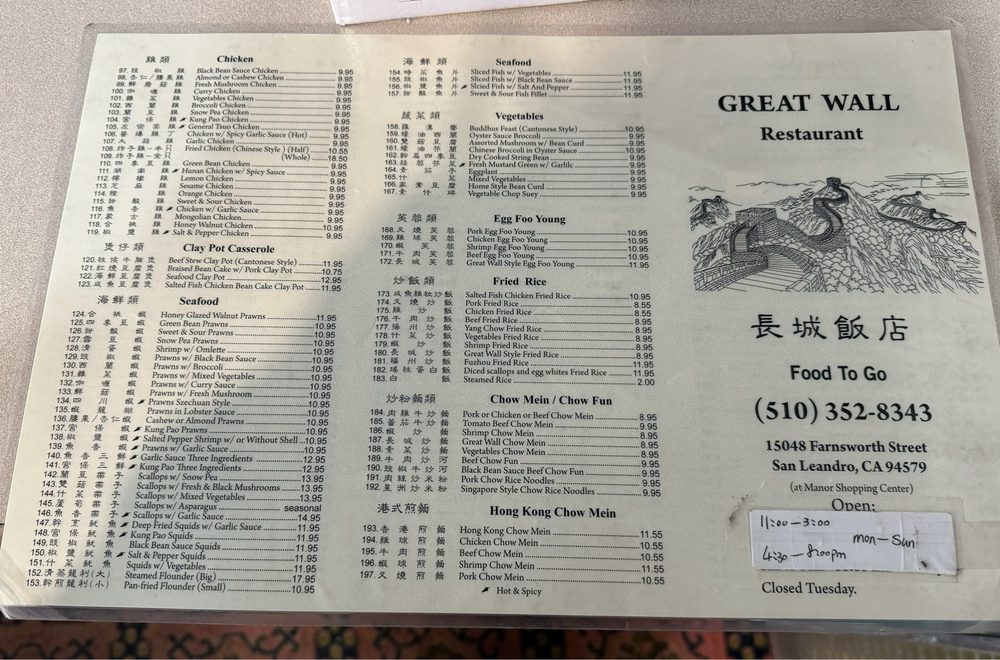 Great Wall Restaurant is a casual dining spot in San Leandro, CA, offering a variety of Chinese dishes. With options for vegetarians and a diverse menu that includes appetizers like Egg Rolls and Barbecued Spare Ribs, soups such as Hot and Sour Soup, and chicken dishes like Moo Goo Gai Pan, there is something for everyone. Customers have praised the delicious food and excellent service, making it a popular choice for both takeout and dining in. The cozy atmosphere and affordable prices make it a great place to enjoy authentic Cantonese cuisine. Whether you're craving classic Chinese comfort food or looking to try something new like the spicy squid, Great Wall Restaurant is a must-visit for a satisfying meal.
